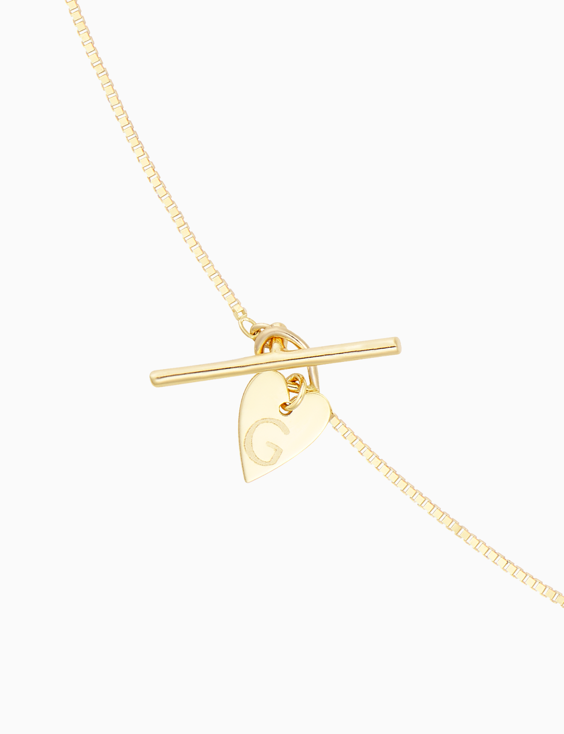 18kt yellow gold Venetian chain necklace with a toggle clasp and a heart-shaped pendant, customizable with the letter of your choice. The total chain length is 38 cm. Available in 18kt yellow gold.