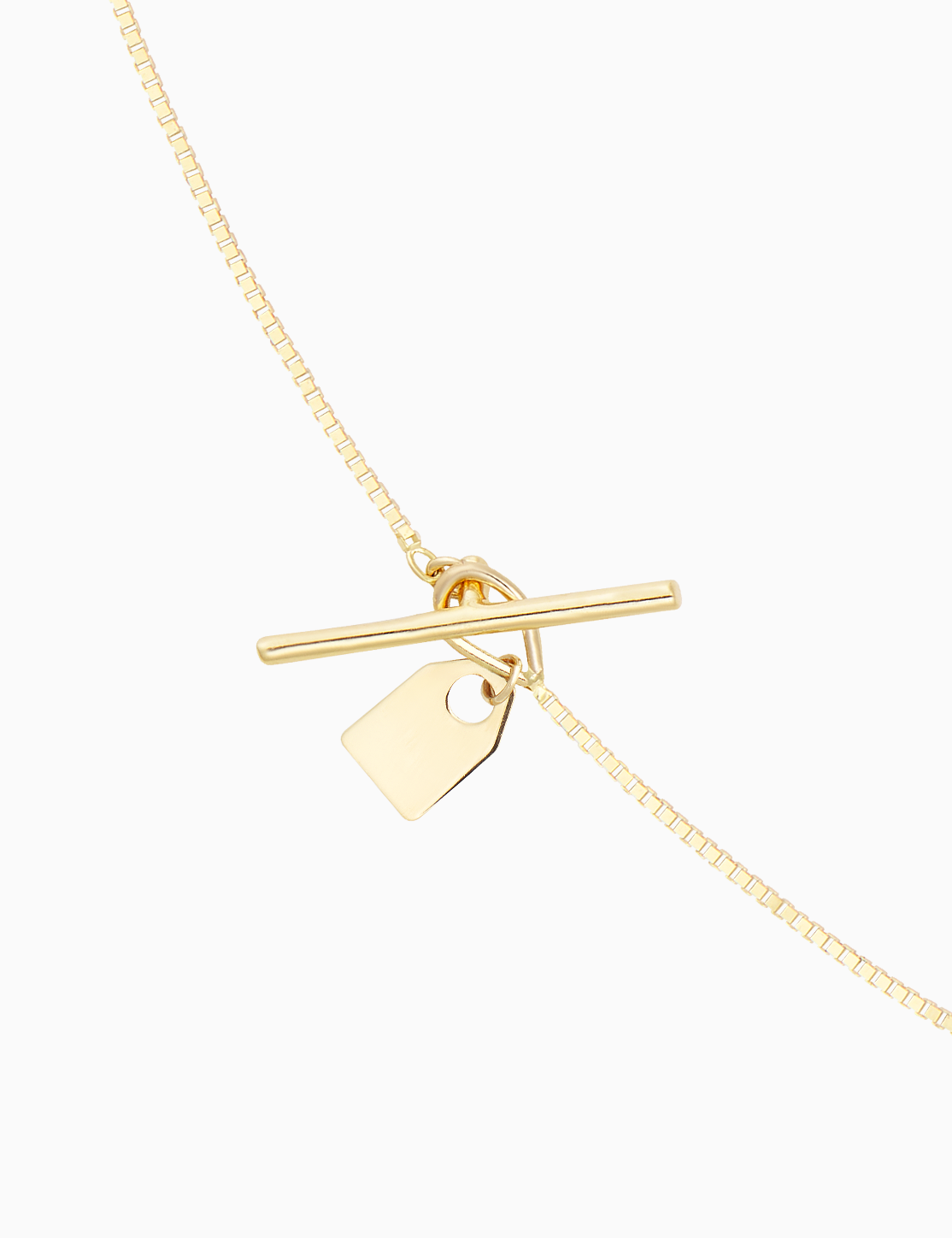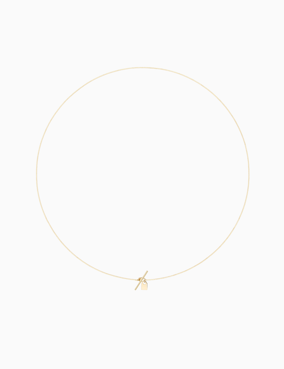18kt yellow gold necklace featuring a venetian chain and a T-bar clasp featuring a customisable plate. The total length of the chain is 38 cm. Available in 18kt yellow gold.