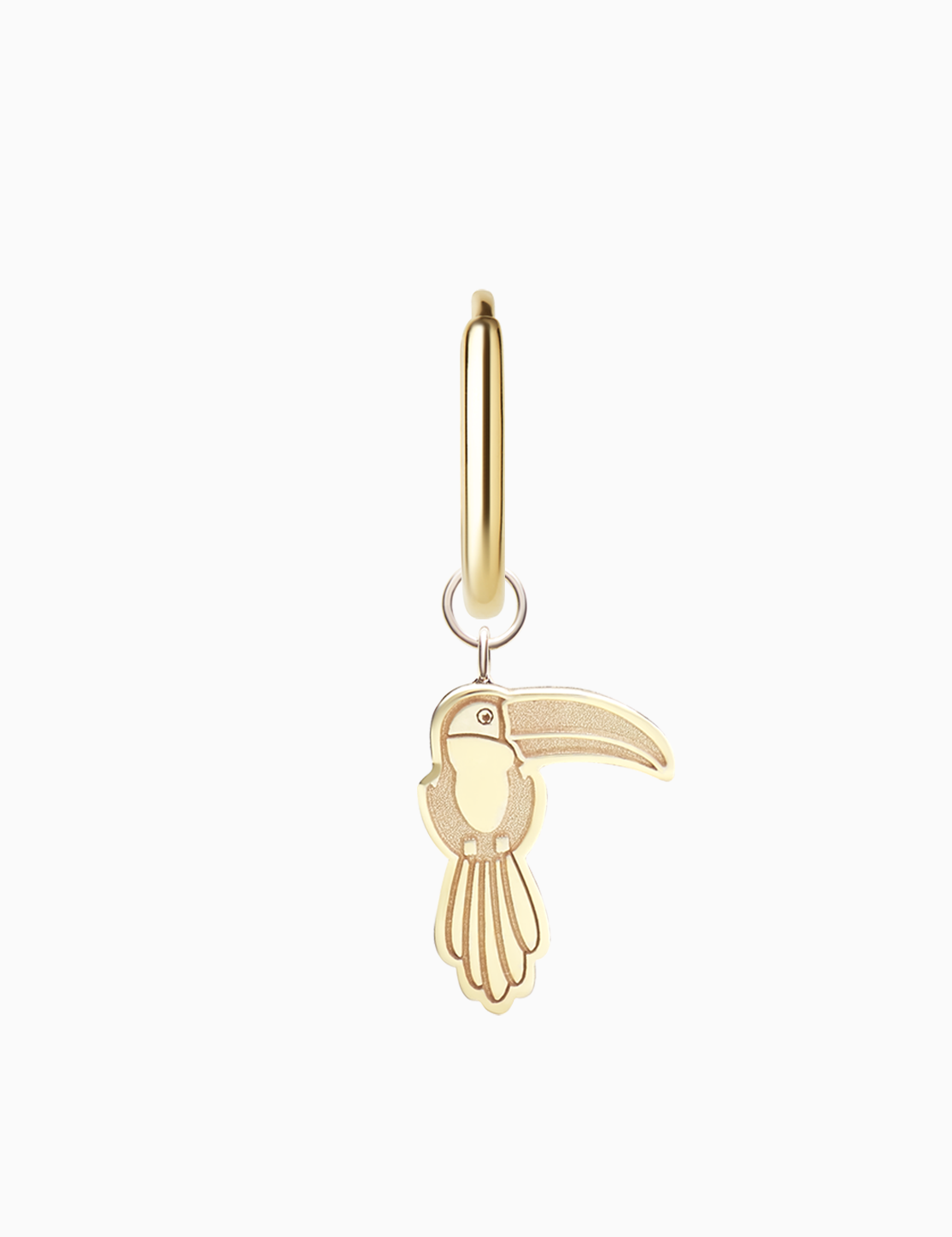 Charm a forma di tucano realizzato su lastra in oro giallo 18kt. Ciascun charm misura circa 1 cm di altezza compreso l’anellino, mentre il diametro interno dell’anello è 2 mm. Compatibile con i nostri modelli di orecchini creola con chiusura a scatto in tutte le misure, Extra Small, Small, Medium, e Large. Disponibile in oro giallo 18kt. Venduto singolarmente.