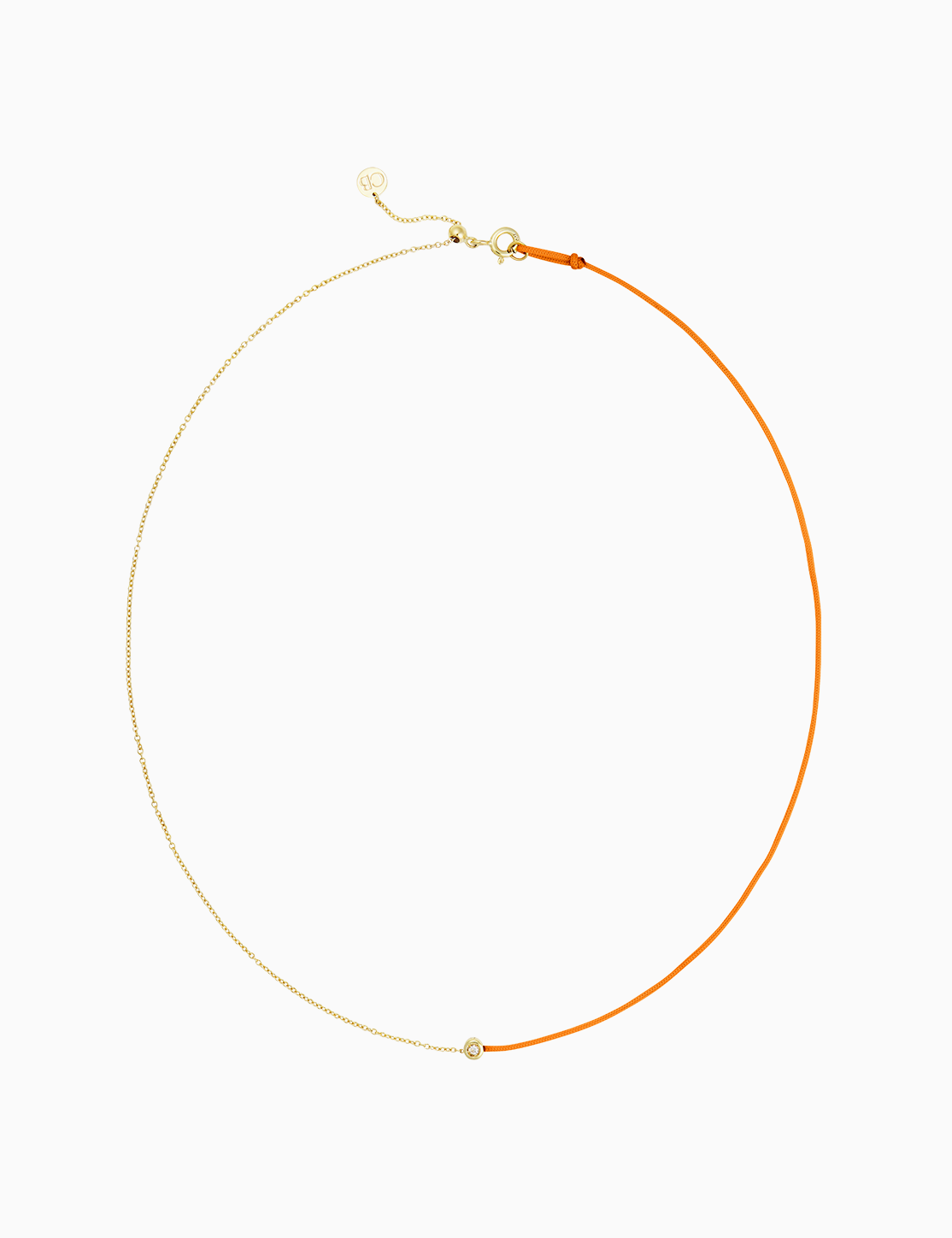 Girocollo della collezione Palette impreziosito da un diamante bianco da 0,02 ct che abbraccia due elementi: l’oro della catena e il cordino colorato. Disponibile in oro giallo, oro rosa e oro bianco, il girocollo Palette ha una lunghezza complessiva di 40 cm ed è dotato di Sliding System che permette di regolarne la lunghezza.