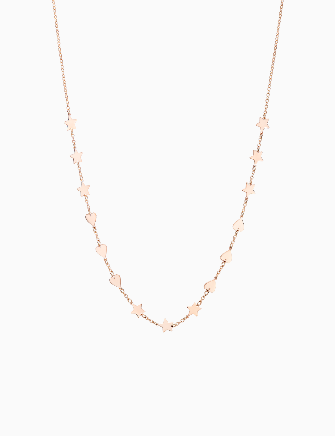 Collana della collezione Dreamers con quindici micro elementi a forma di cuore e stella alternati. La collana misura 40 cm di lunghezza totale ed è dotata di sistema sliding per la messa a misura. Disponibile a scelta in oro giallo, rosa, o bianco.