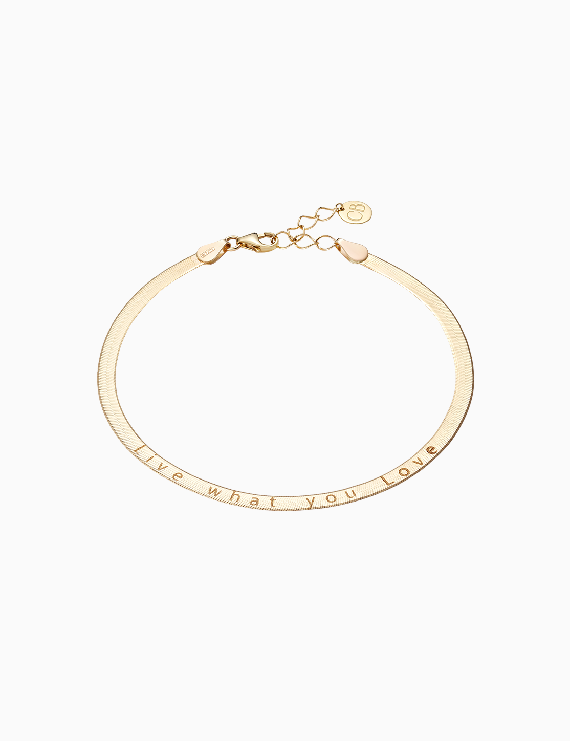 Bracciale con catena herringbone con incisione “live what you love” della collezione Storytelling in oro 9kt. Il bracciale è dotato di chiusura con moschettone ed anellini di adjuster, per una lunghezza complessiva di 19 cm. Disponibile in oro giallo.