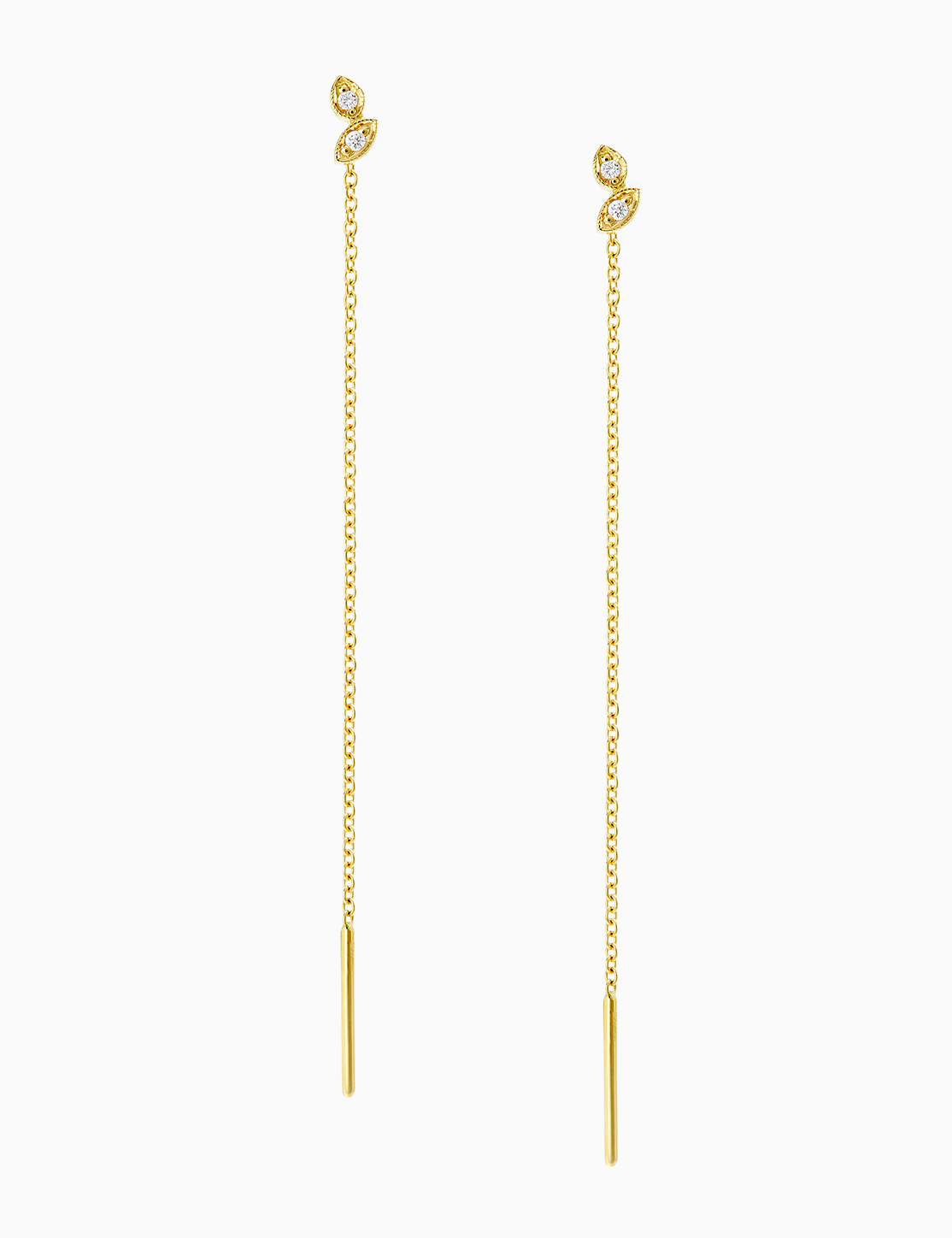 Orecchini in oro 18 carati della collezione Oui Diamonds con catena morbida e gocce in oro e diamanti bianchi da 0.03 carati totali. La lunghezza di ciascun orecchino è di circa 6 cm e può variare leggermente, essendo un articolo realizzato completamente a mano. Questo orecchino si indossa comodamente infilando frontalmente la guida nel lobo e facendo scorrere la catena fino ad accomodare le gocce d’oro. Disponibili a scelta in oro giallo, rosa, o bianco.