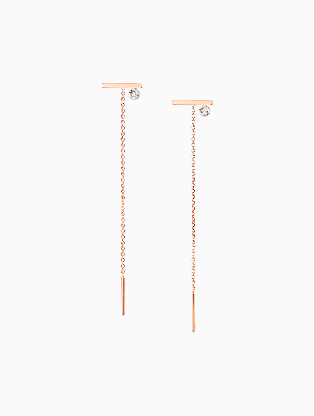Orecchini in oro 18 carati della collezione Oui Diamonds catena morbida, barrette in oro e diamanti bianchi da 0.02 carati totali. La lunghezza di ciascun orecchino è di circa 6 cm e può variare leggermente, essendo un articolo realizzato completamente a mano. Questo orecchino si indossa comodamente infilando frontalmente la guida nel lobo e facendo scorrere la catena fino ad accomodare le barrette d’oro. Disponibili a scelta in oro giallo, rosa, o bianco.