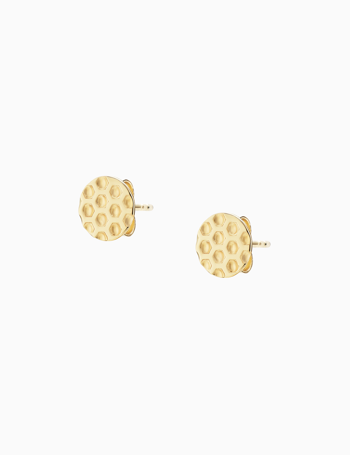 Orecchini a lobo con cialda in oro giallo 18kt lavorato a mano di forma tonda. La pietra ha un diametro di 8 mm ed è dotata di perno a farfalla sul retro.