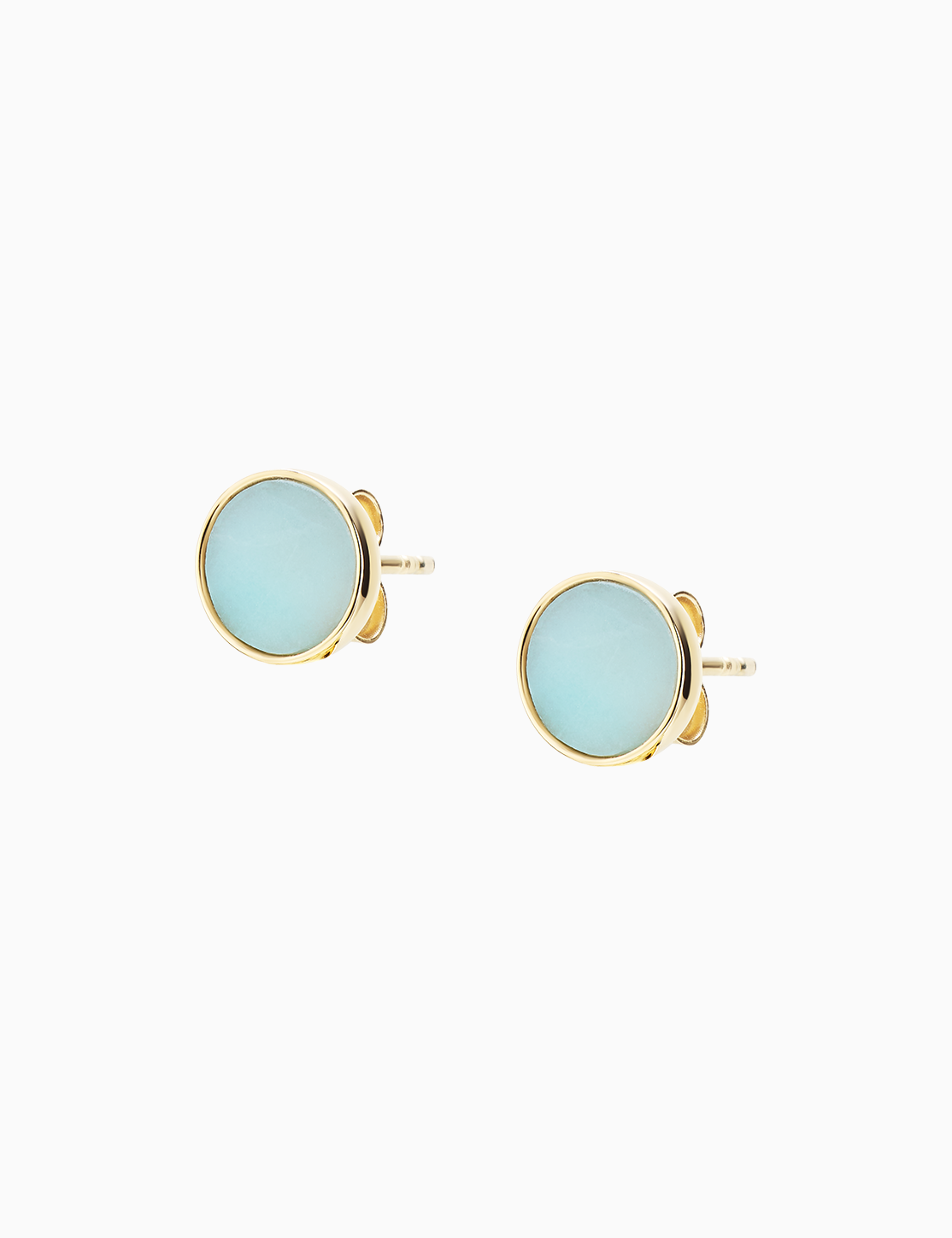 Orecchini a lobo in oro giallo 18kt con pietra amazzonite di forma tonda. La pietra ha un diametro di 8 mm ed è dotata di perno a farfalla sul retro.