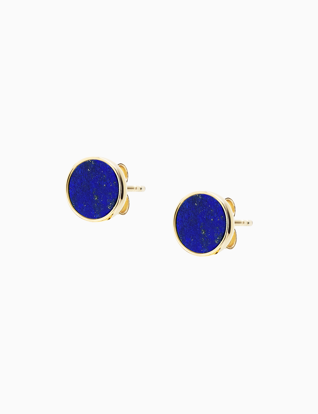 Orecchini a lobo in oro giallo 18kt con pietra lapislazzuli di forma tonda. La pietra ha un diametro di 8 mm ed è dotata di perno a farfalla sul retro.
