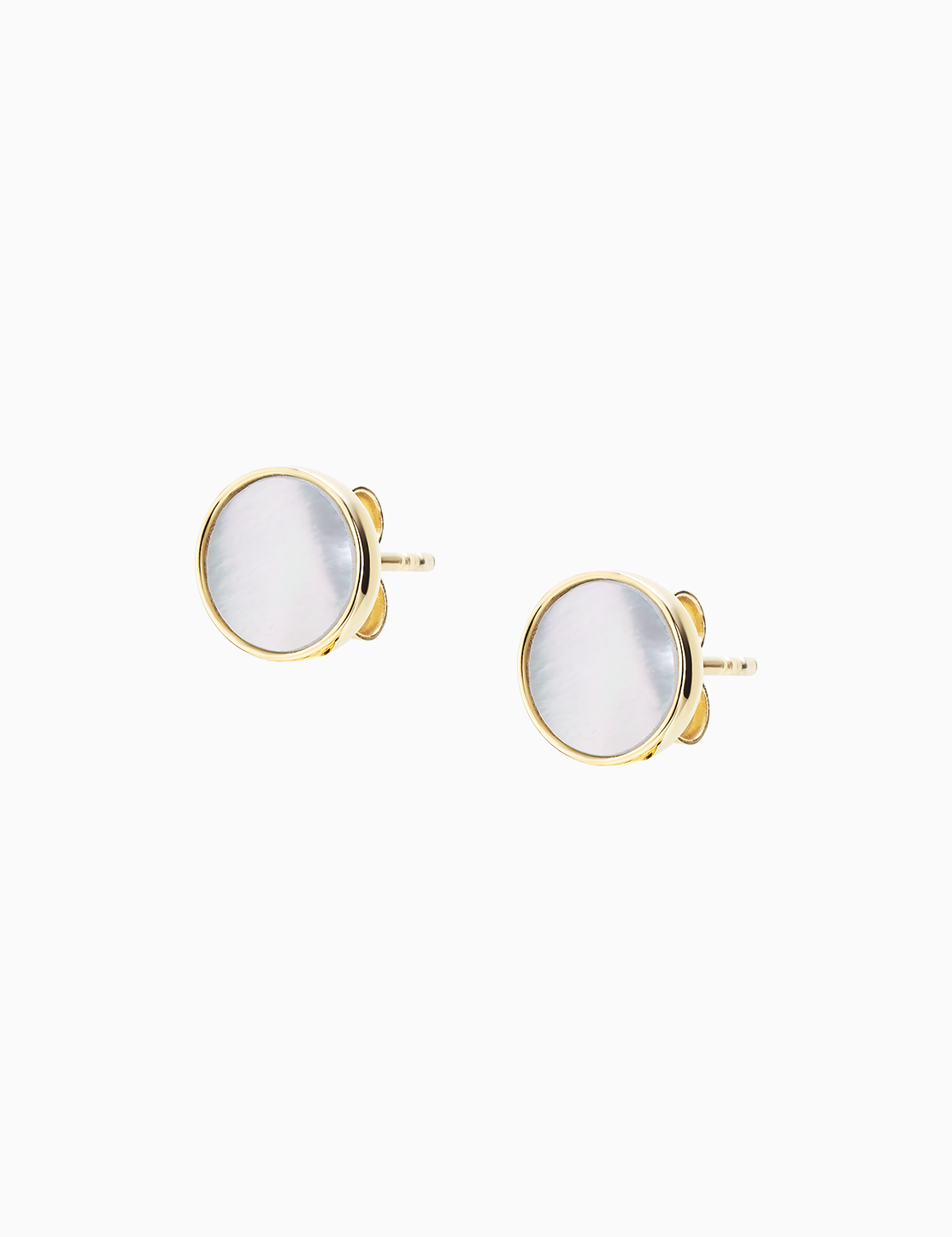 Orecchini a lobo in oro giallo 18kt con pietra madreperla di forma tonda. La pietra ha un diametro di 8 mm ed è dotata di perno a farfalla sul retro.