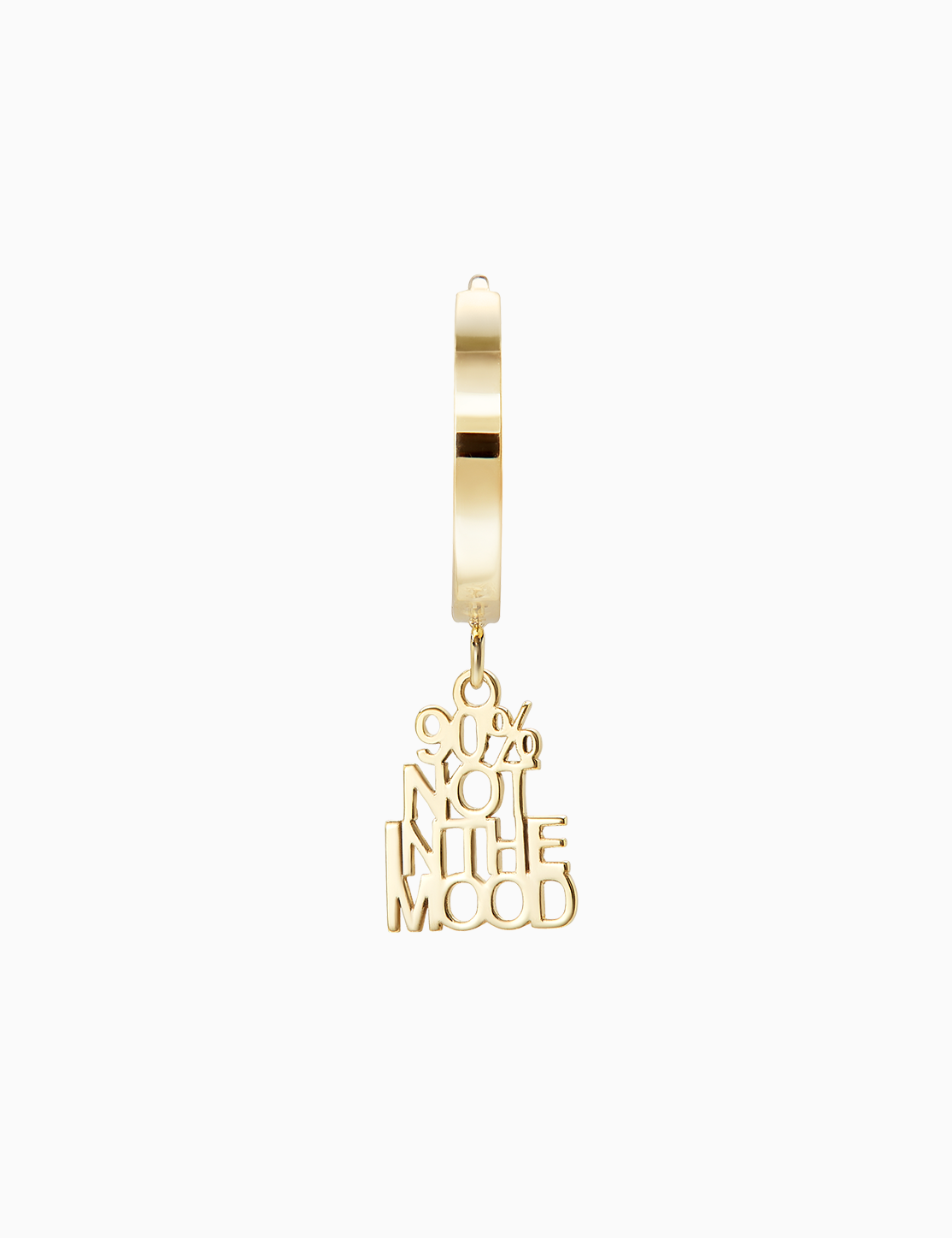 Orecchino modello creola a scatto in oro 18kt con scritta pendente “90% Not In The Mood”. Altezza complessiva del singolo orecchino: 2,3 cm circa. Disponibili in oro giallo. Venduto singolarmente.