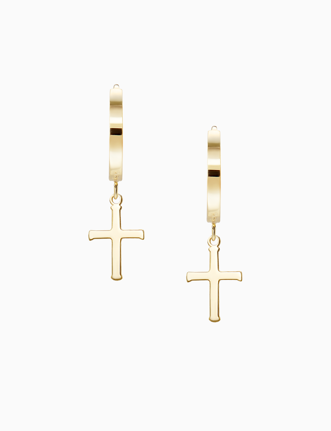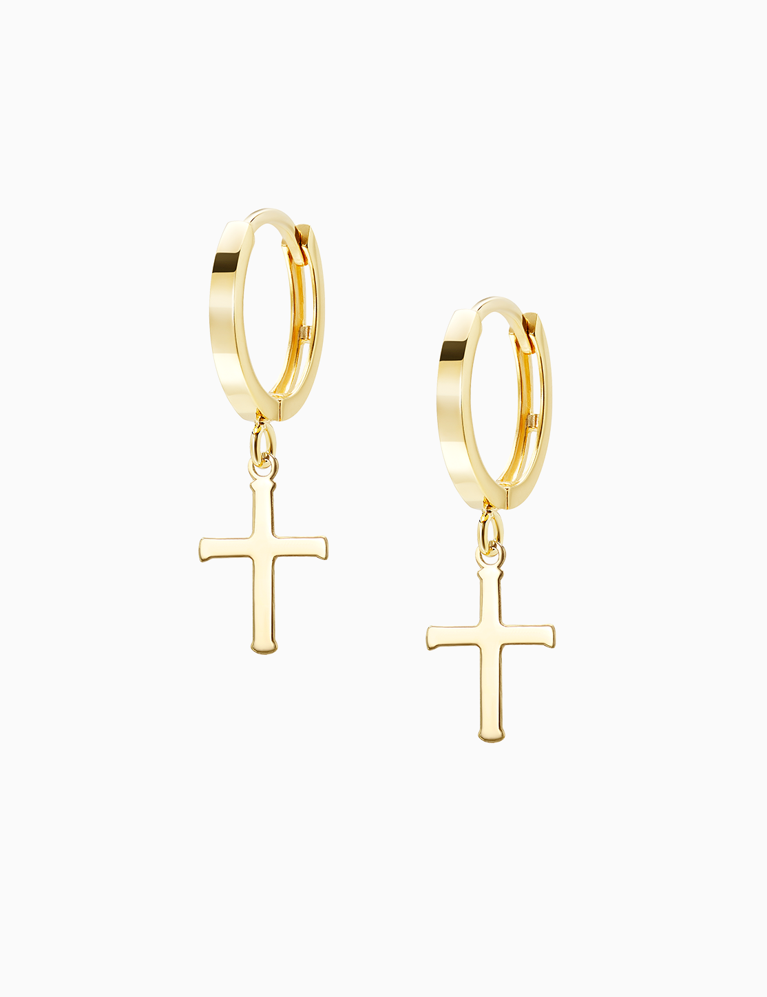 Orecchini modello creola a scatto in oro 18kt con croci pendenti. Altezza complessiva del singolo orecchino: 2 cm circa. Disponibili in oro giallo, oro rosa, ed oro bianco. Venduto in coppia.