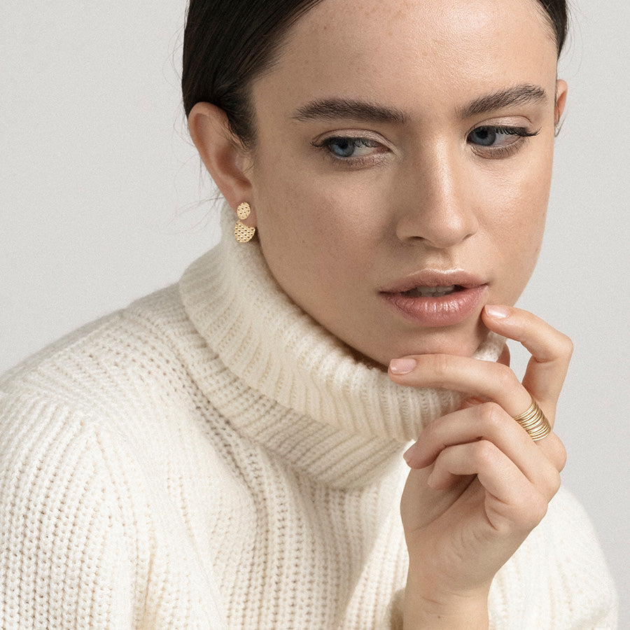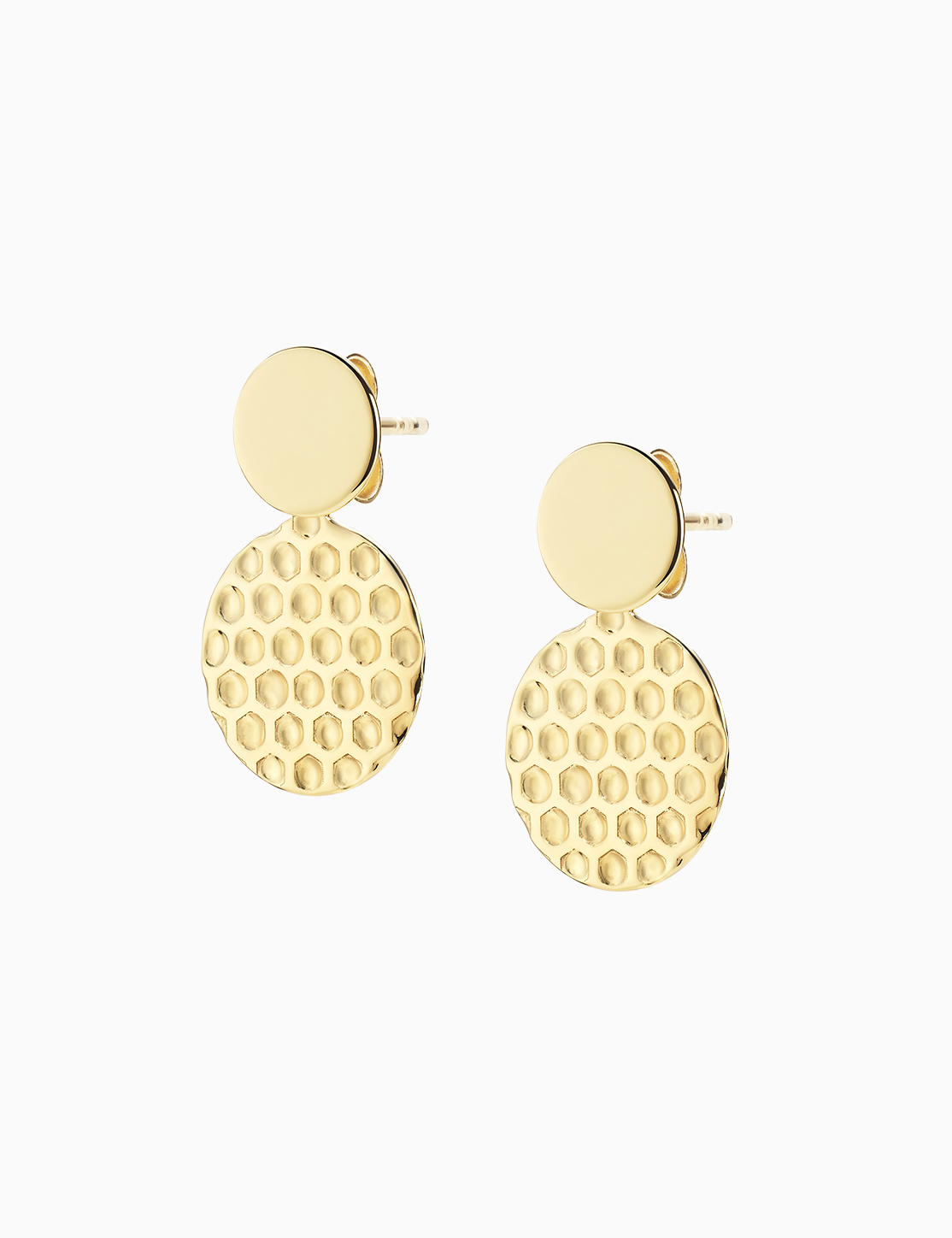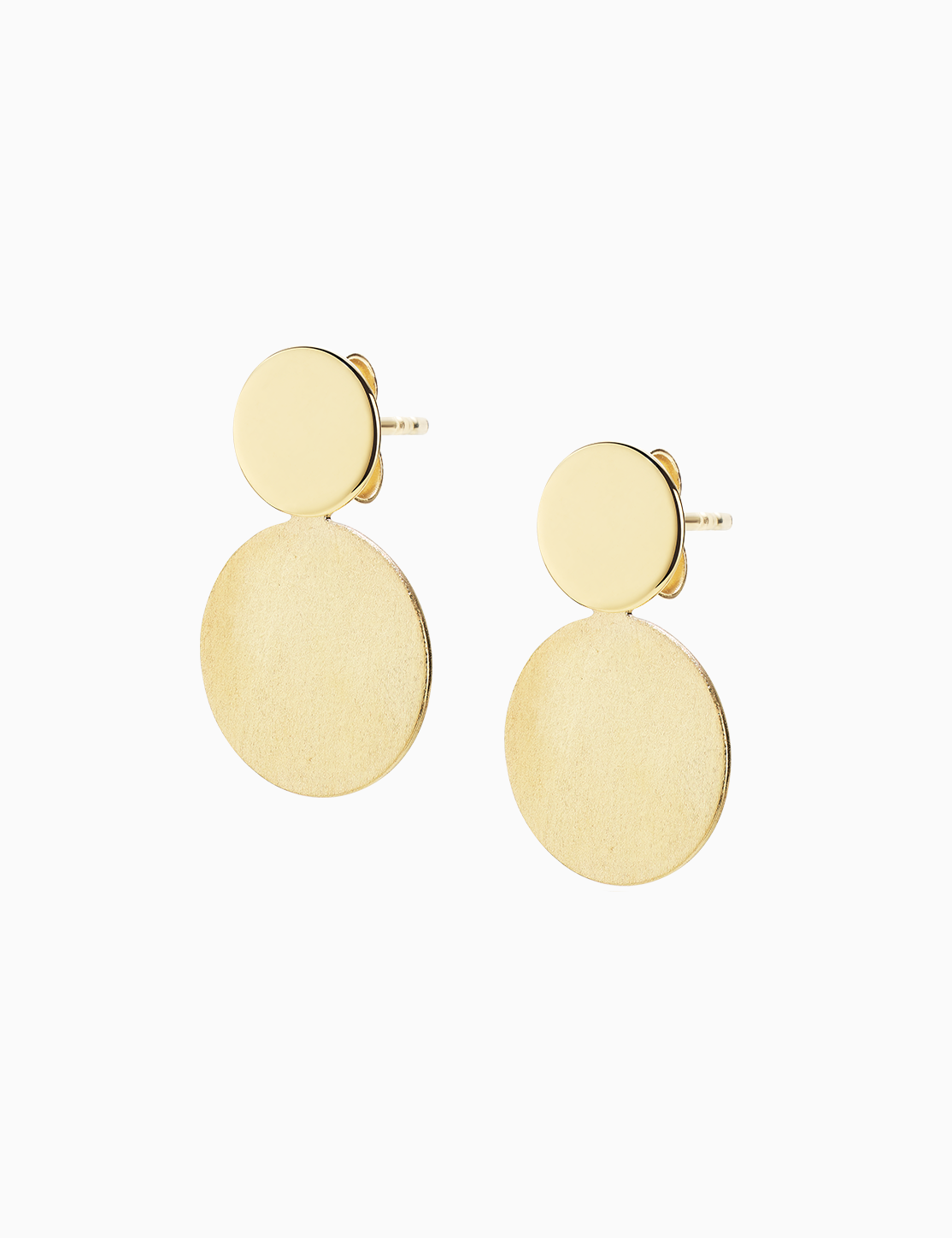Orecchini pendenti in oro giallo 18kt con cialda a lobo di forma tonda lavorata a mano e cialda più grande, rimovibile ed adattabile in lunghezza. La lunghezza totale dell’orecchino va dai 1,7 cm (perno posizionato nel foro inferiore) ai 2 cm (perno posizionato nel foro superiore). Gli orecchini sono dotati di chiusura con perno e farfalla. Venduti al paio.