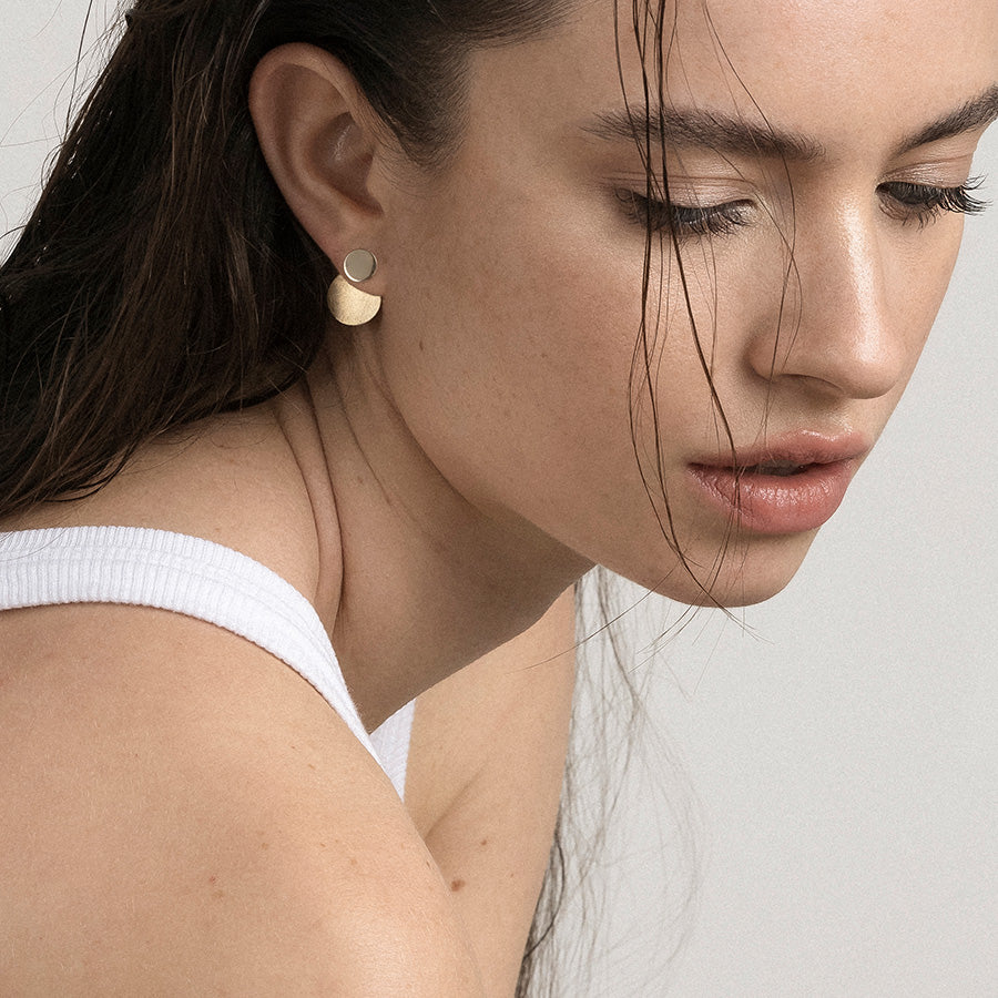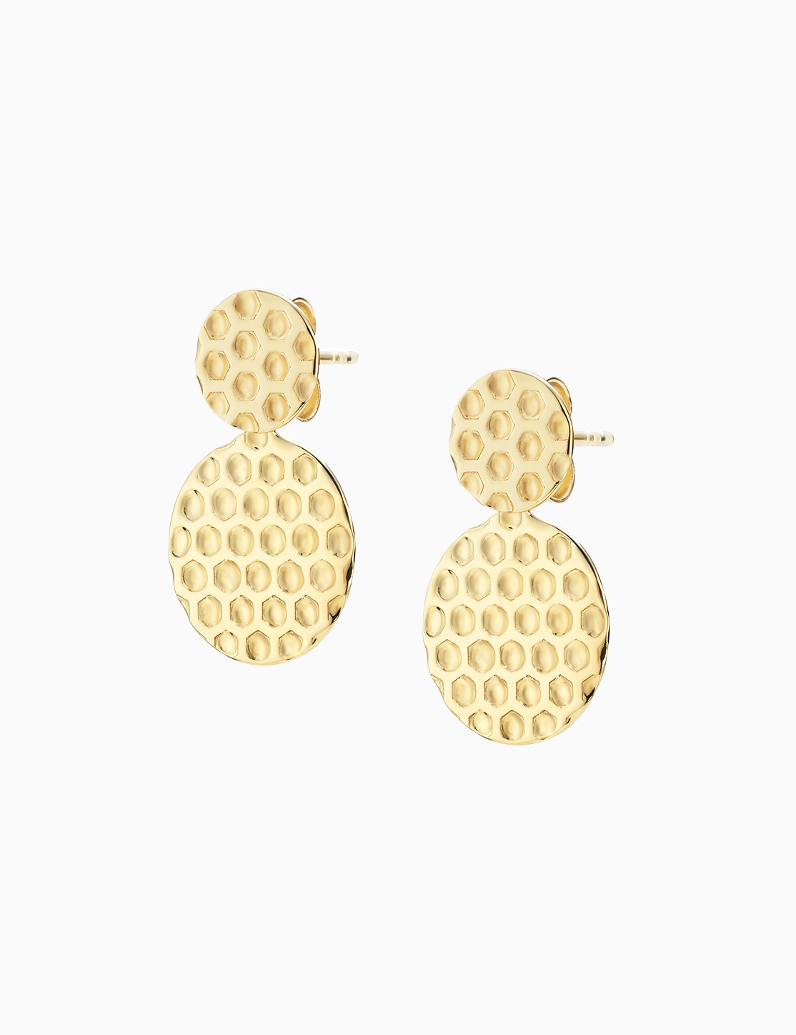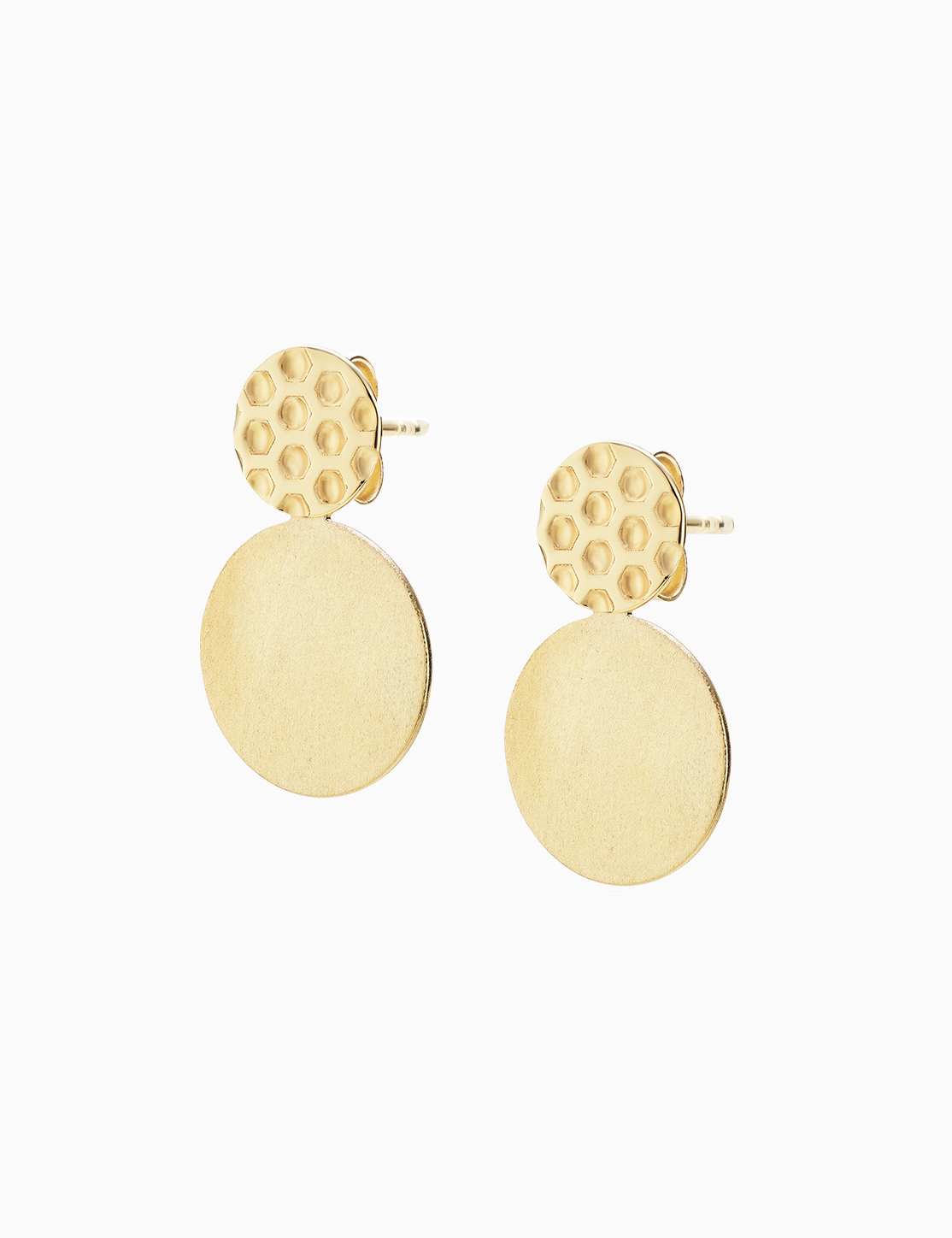 Orecchini pendenti in oro giallo 18kt con cialda a lobo di forma tonda lucida e cialda più grande, rimovibile ed adattabile in lunghezza. La lunghezza totale dell’orecchino va dai 1,7 cm (perno posizionato nel foro inferiore) ai 2 cm (perno posizionato nel foro superiore). Gli orecchini sono dotati di chiusura con perno e farfalla. Venduti al paio.