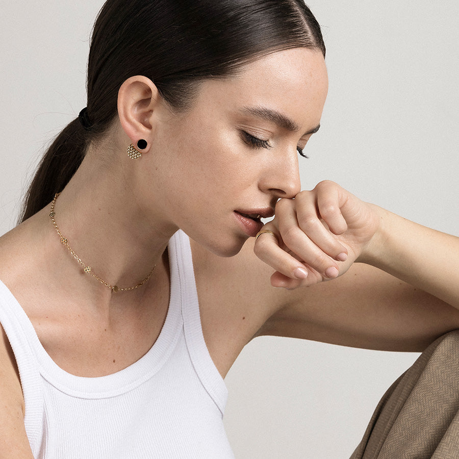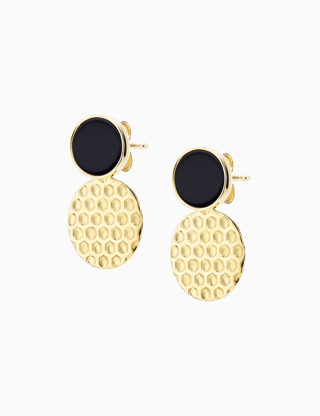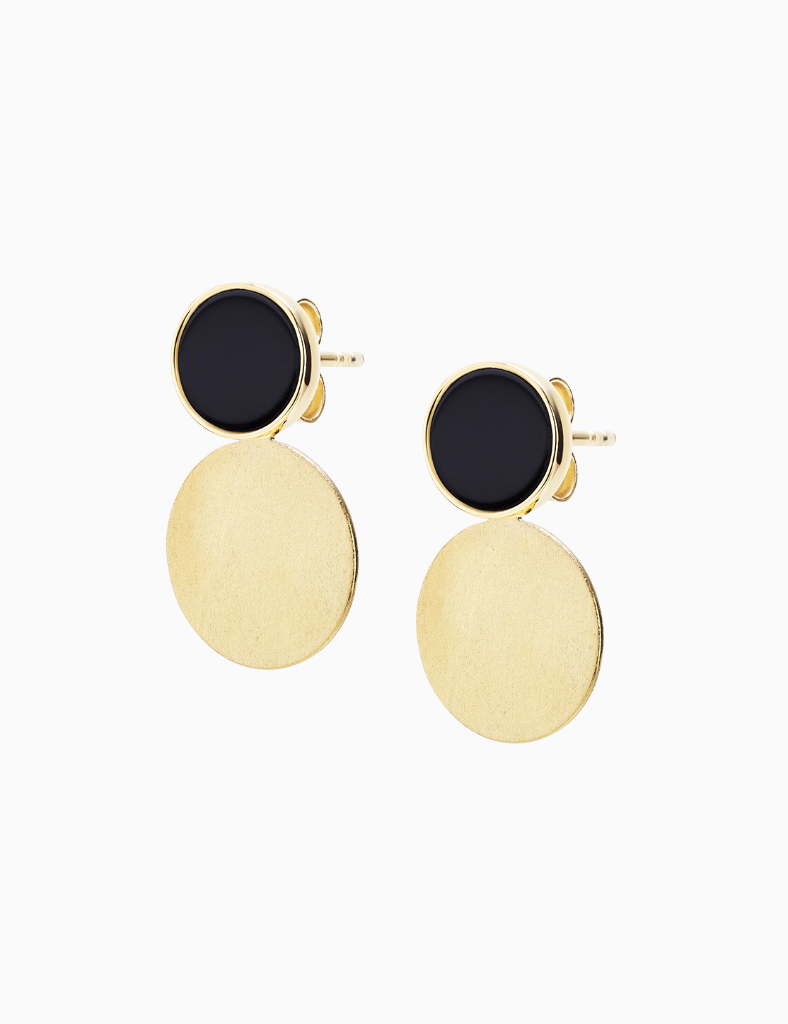 Orecchini pendenti in oro giallo 18kt con cialda a lobo di forma tonda in onice e cialda più grande, rimovibile ed adattabile in lunghezza. La lunghezza totale dell’orecchino va dai 1,7 cm (perno posizionato nel foro inferiore) ai 2 cm (perno posizionato nel foro superiore). Gli orecchini sono dotati di chiusura con perno e farfalla. Venduti al paio.