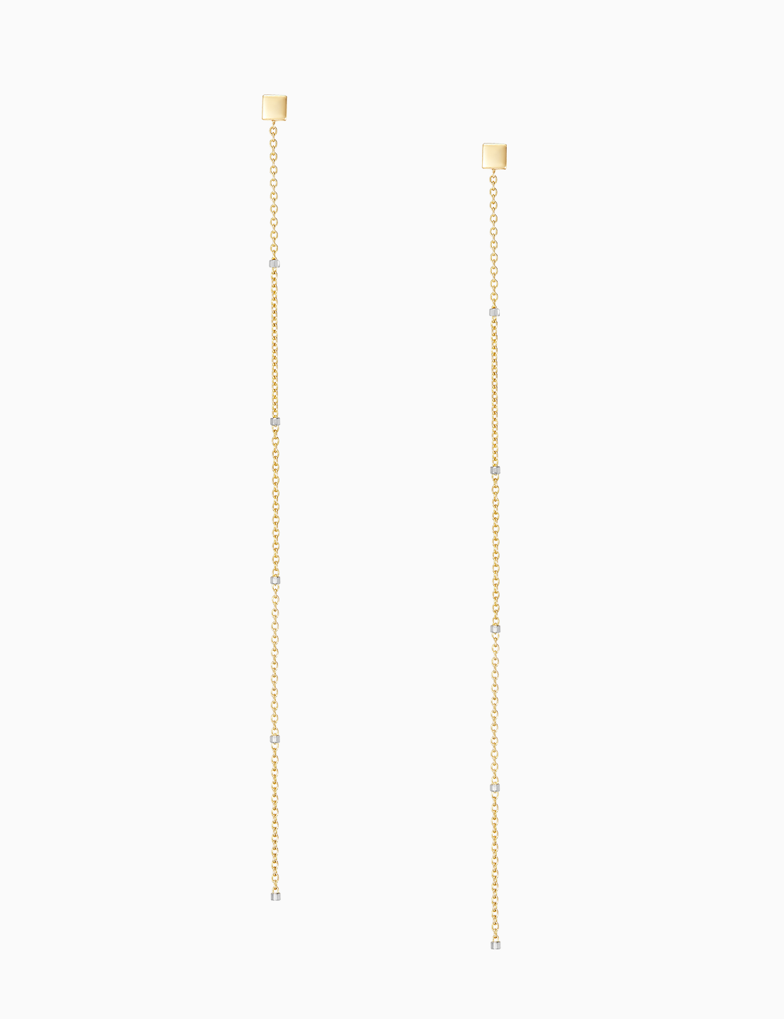 Orecchini pendenti della collezione Mood con chiusura a pernon e catena Saturno. Gli orecchini sono lunghi circa 9.5 cm, ma la misura potrebbe differire leggermente essendo un prodotto realizzato interamente a mano. Disponibile a scelta in oro giallo, rosa, o bianco.