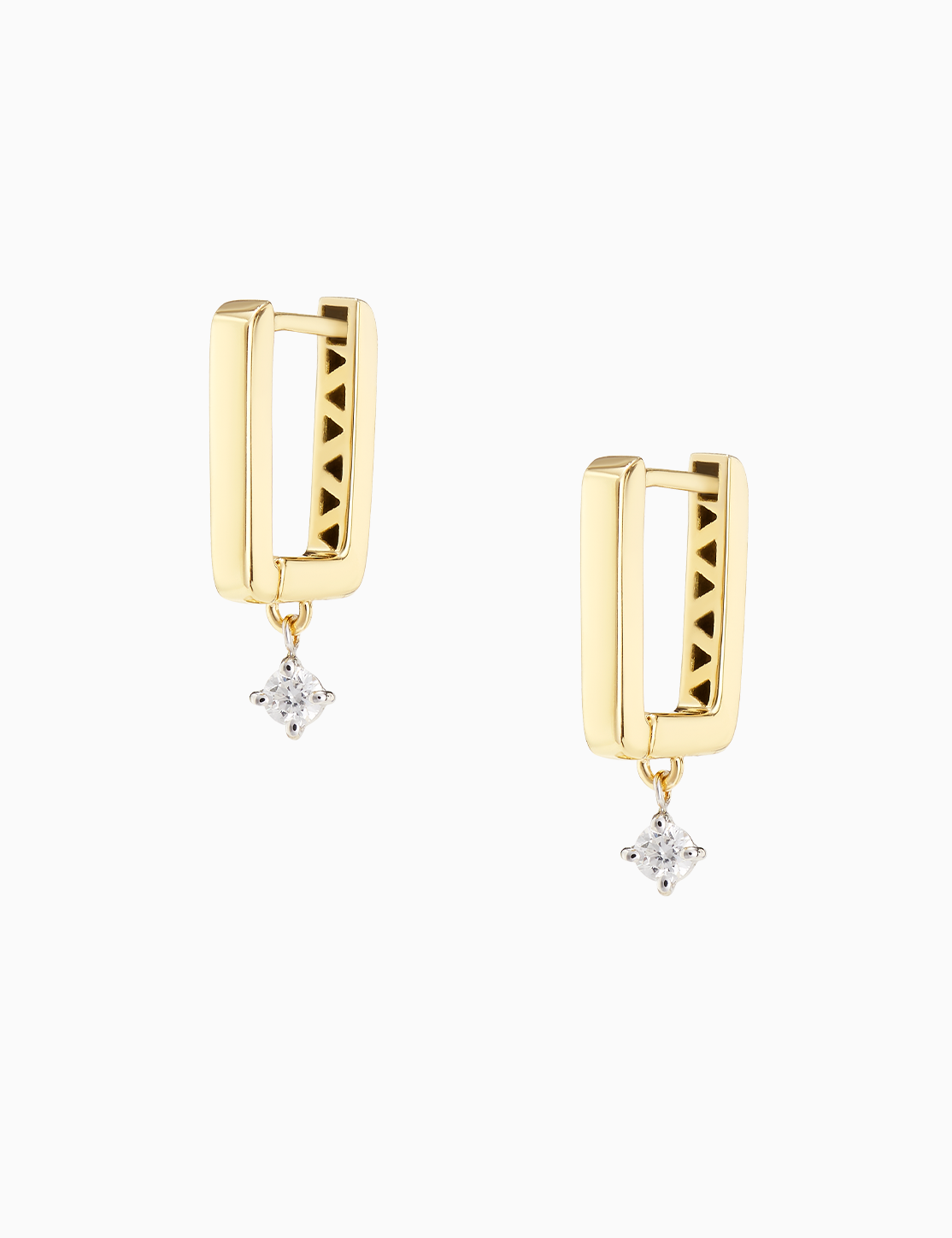 Orecchini in oro giallo 18kt di forma squadrata dotati di chiusura a scatto e diamante bianco pendente da 0.10 ct totali. Gli orecchini misurano 1 cm di altezza e 0,9 cm di profondità. Disponibili in oro giallo 18kt.