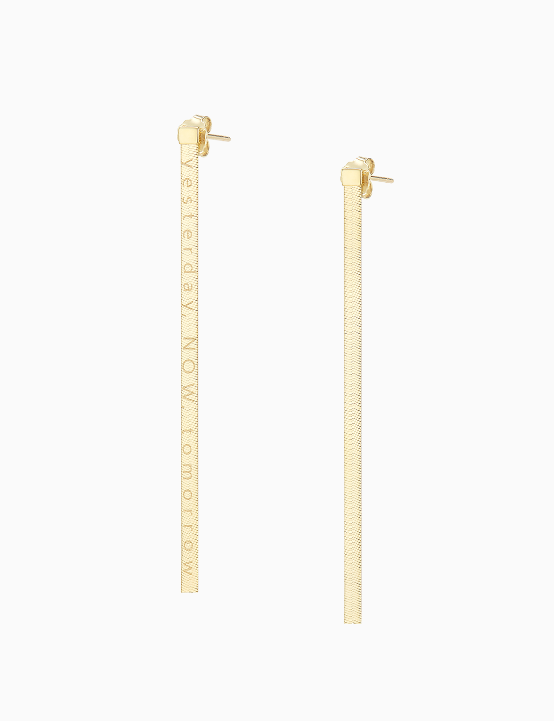 Orecchini con catena herringbone con incisione “yesterday, now, tomorrow” della collezione Storytelling in oro 9kt. Gli orecchini sono dotati di chiusura con perno e farfalla (lunghezza totale 6,5 cm circa). Disponibili in oro giallo.