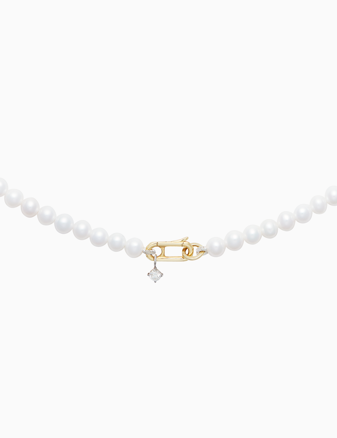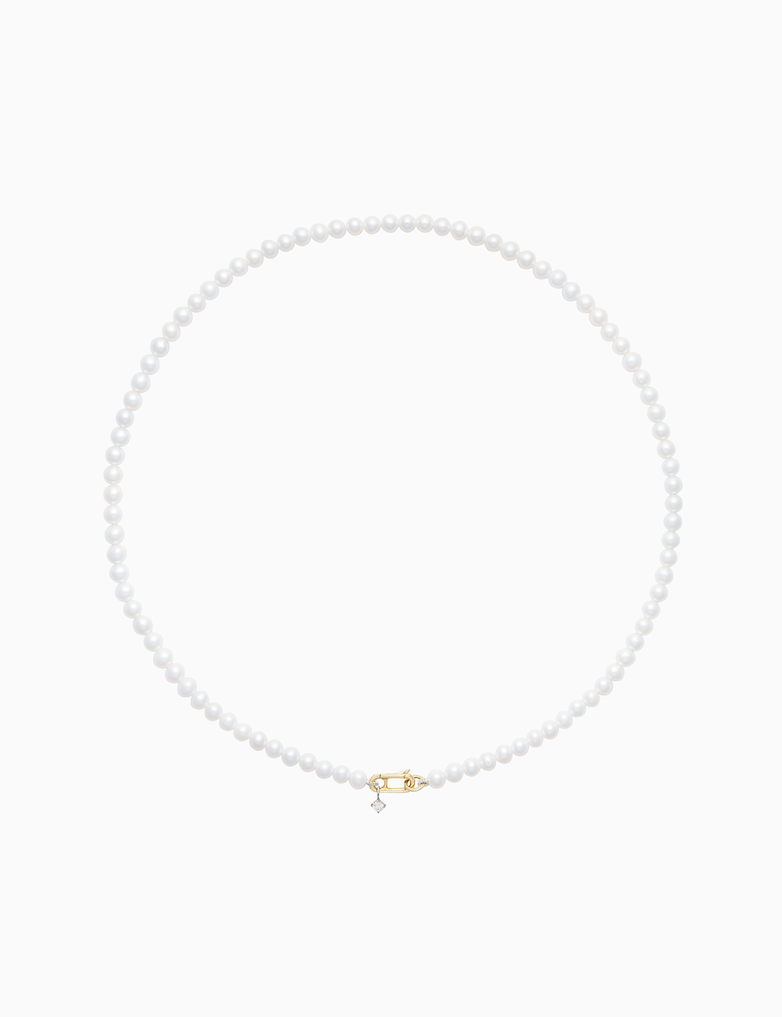 Collana con perle coltivate di diametro 4 mm circa con chiusura a moschettone in oro 18kt giallo e diamante bianco pendente da 0.05 ct. La lunghezza complessiva della collana è 40 cm. Disponibile in oro giallo 18kt.